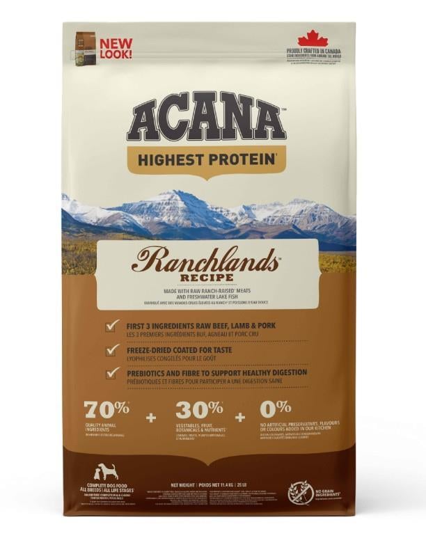 ACANA Ranchlands, çiftlikte yetiştirilen çiğ etler ve Tatlısu gölü balıkları ile yüklüdür. Doğa Ananın köpeğiniz için sağlayacağı beslenmeyi taklit ederek, et, balık organları ve kemik dâhil olmak üzere tüm hayvan içeriklerini kullanıyoruz, böylece köpeğiniz mutlu, sağlıklı ve güçlü kalmak için ihtiyaç duyduğu her tür besini almış oluyor.
