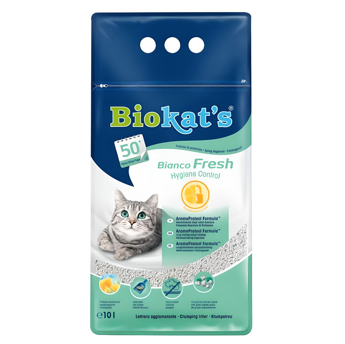 Biokat’s Bianco Fresh Hijyen Kontrolü Kedi Kumu, ekstra güçlü emiciliği olan beyaz topaklanan bentonit bir kedi kumudur ve orta tanelidir.