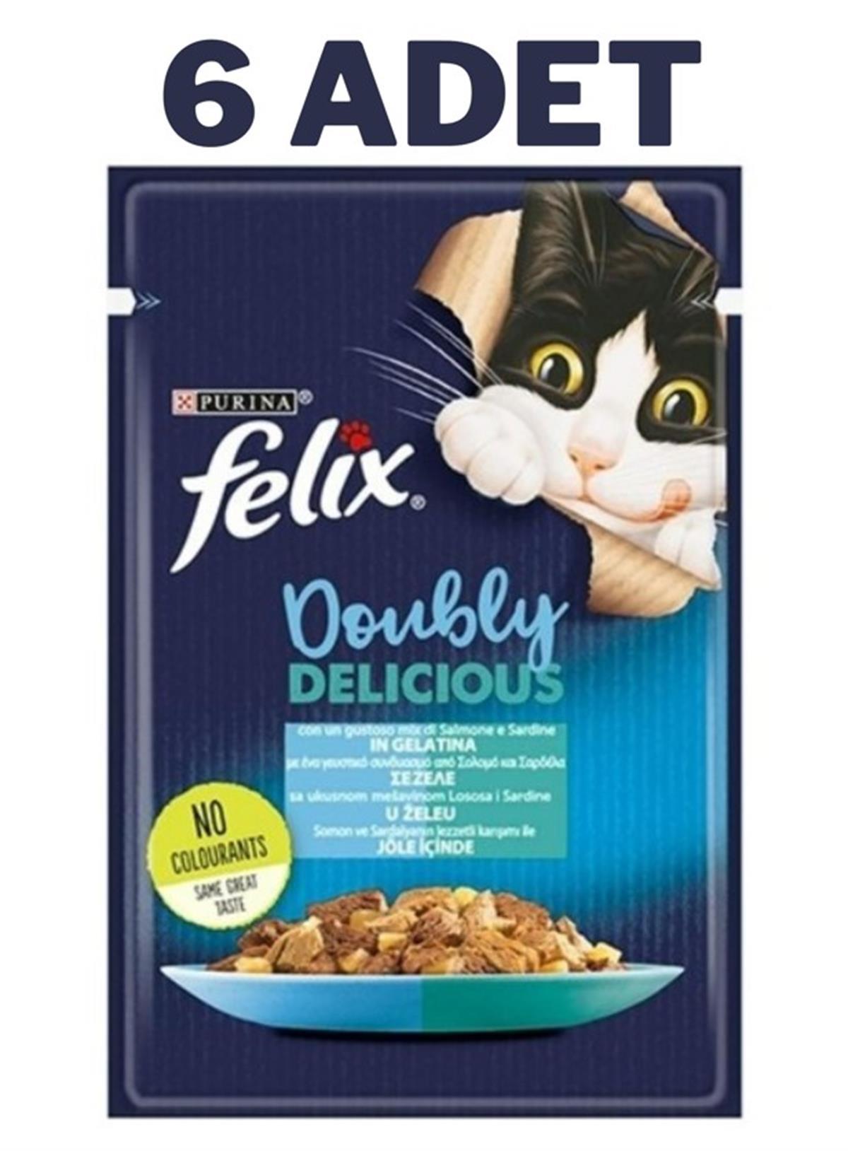 Felix yaş mama, yetişkin kediler için, jöle içerisinde, gerçek somon ve sardalya parçacıkları içeren, çifte lezzetli pouch kedi maması çeşididir.