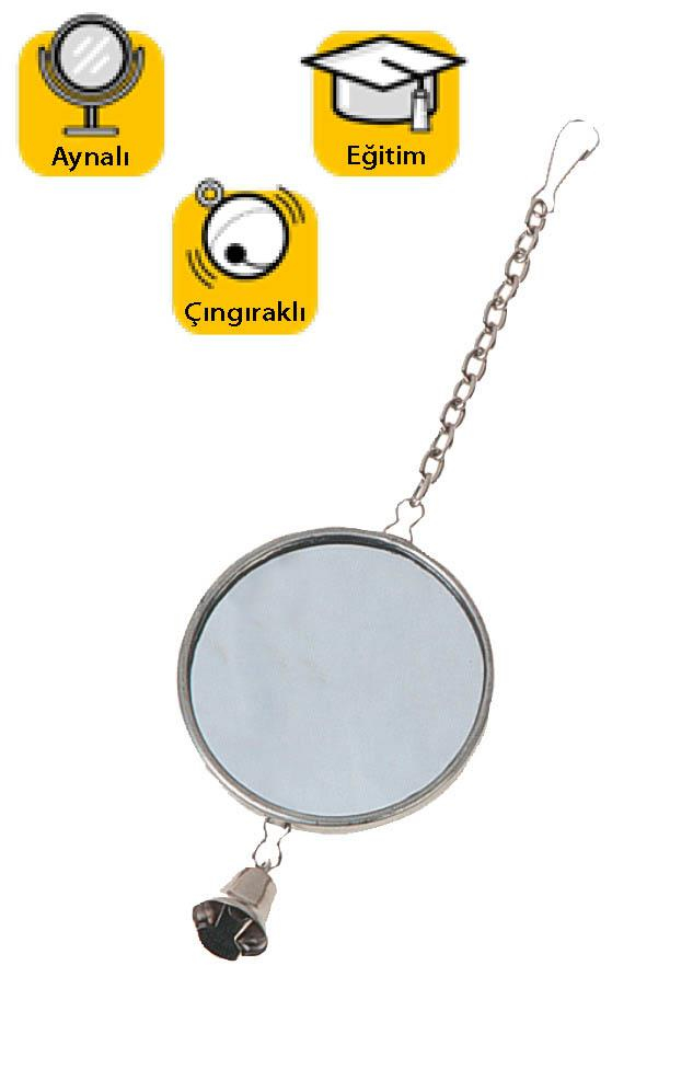 PAPAĞAN VE TÜREVLERİ İÇİN METAL ÇERÇEVELİ VE ZİNCİRLİ AYNA. 5 CM ÇAPINDA.