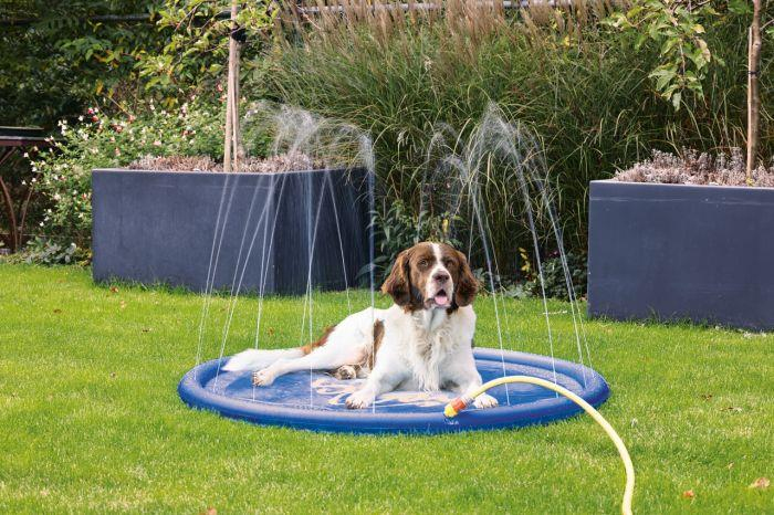 Yağmurlama Matı, sıcak günlerde köpeklere hoş bir soğutma sağlar. Sağlam paspas, birlikte verilen konektörü kullanarak bir su Hortumuna bağlandığında suyun sıçradığı çeşitli küçük deliklere sahiptir. Bu nedenle, köpeğin sadece Paspasın üzerine uzanması ve soğutma su jetlerinin tadını çıkarması gerekir.