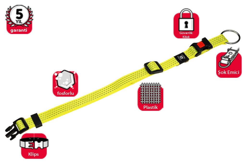 Gerginliği önleyici, dayanıklı naylon malzemeden, metal kısımları krom kaplama boyun tasması. 40-55 cm uzunluk. 20 mm genişlik. M boy. Sarı