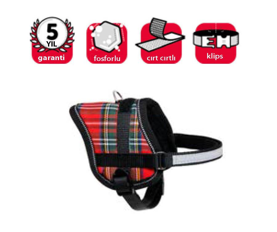 Minik ırk köpekler ve yavru köpekler için ideal, reflektörlü, şık göğüs tasması. Kırmızı-Beyaz renkte. 36-46 cm. 15 mm genişlik.