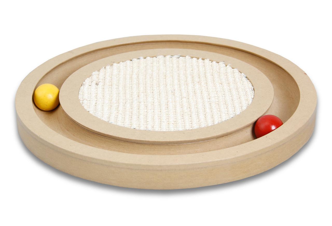 KEDİLER İÇİN TIRMALAMALI VE BİLYELİ AHŞAP OYUNCAK. YÜKSEKLİK 2,5 CM. ÇAP 29 CM.